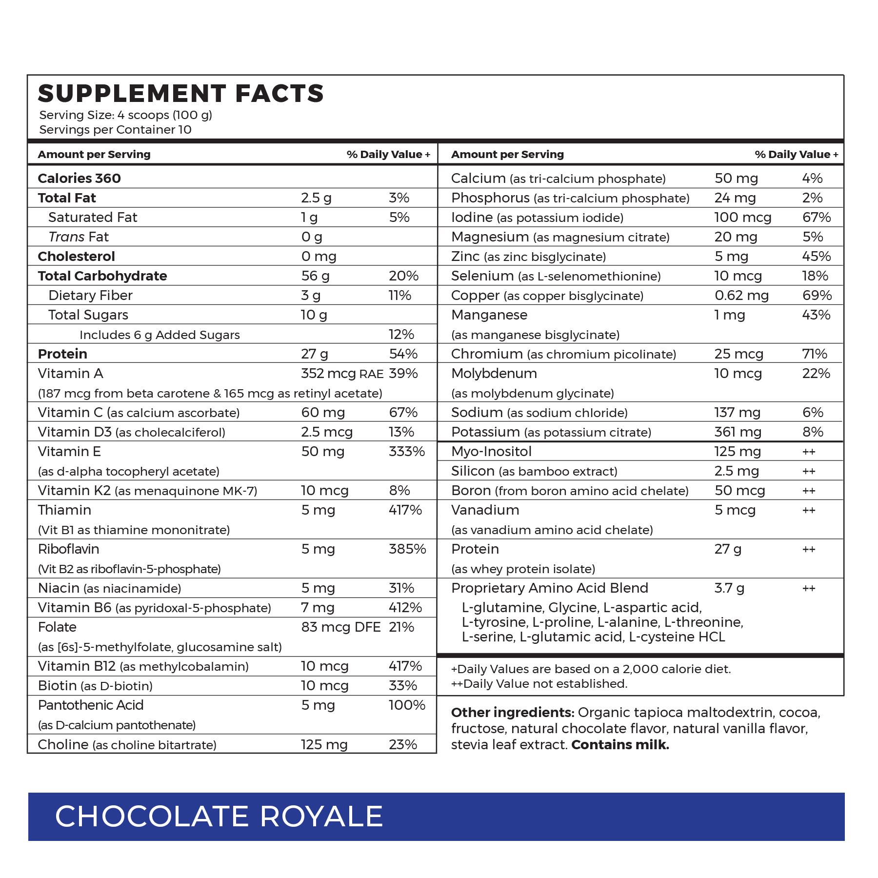 - Protein Source: Whey Protein Isolate (milk) – lactose and casein free